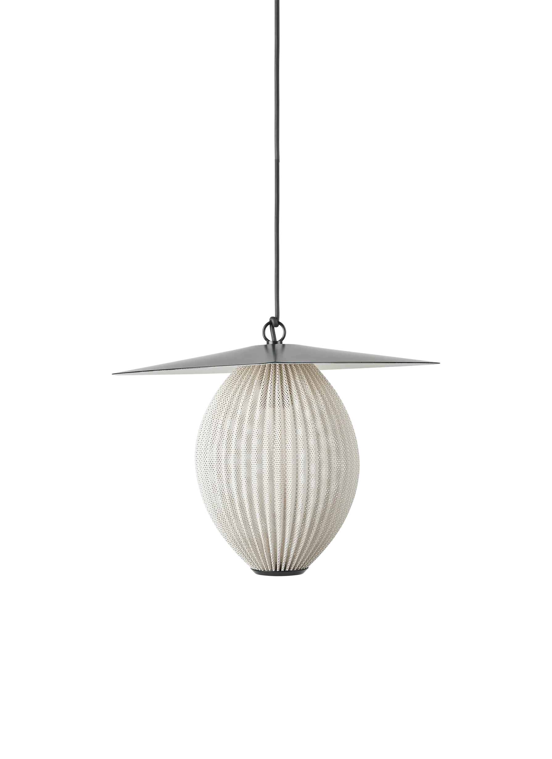Building on the Satellite Collection of whimsical, modernist sculptural lamps, the Satellite Outdoor Pendant and Satellite Outdoor Floor Lamp are GUBI’s first lighting designs created specifically for outdoor use. Based on Mathieu Matégot’s original design concept from 1953, the designs feature an ovoid shade crafted from a perforated sheet of stainless steel, topped with an aluminum cap that helps direct the light. Playful and modern even 70 years after their first creation, both Satellite designs are ideal for installation on covered patios, verandas, or other sheltered dining areas. Two sizes of pendant are available, and both the pendants and the floor lamp are available with a semi-matt shade in either Cream White or Mustard Gold.